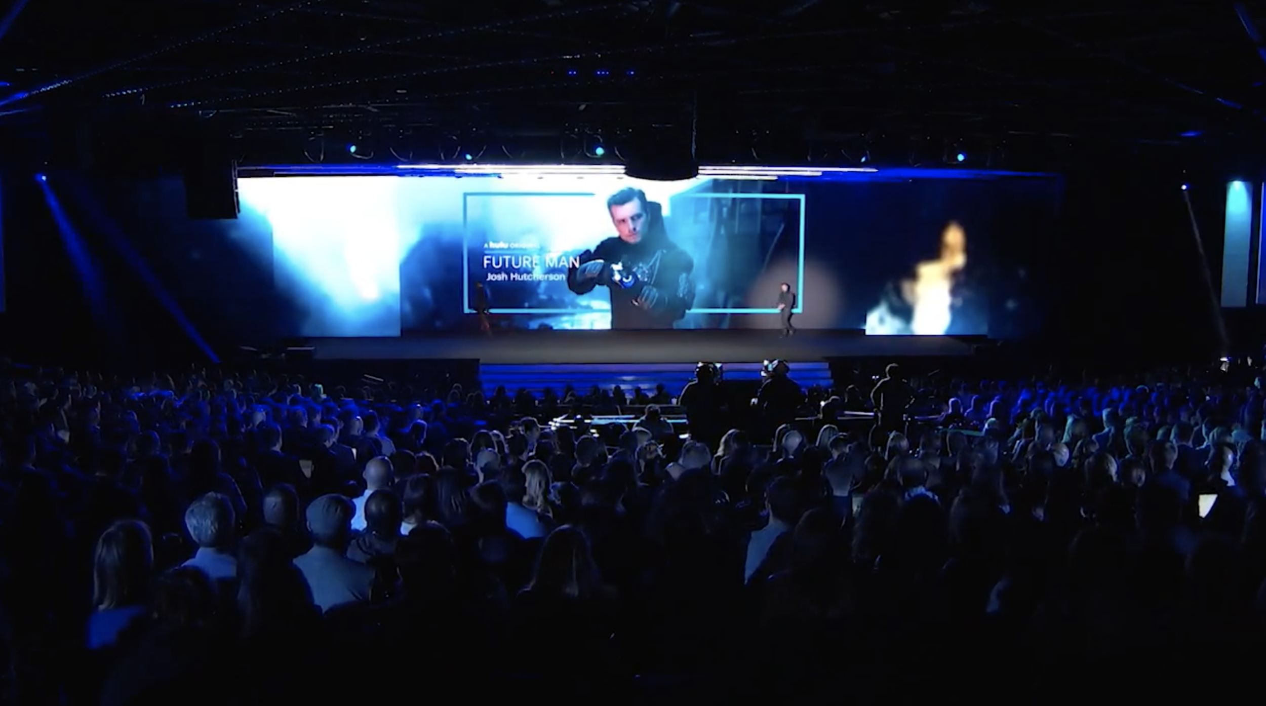In the second year, Hulu invited us back, and the stage setup evolved to a larger, wider screen, giving us the opportunity to create more cinematic and dynamic graphics that showcased Hulu’s expanding content slate.